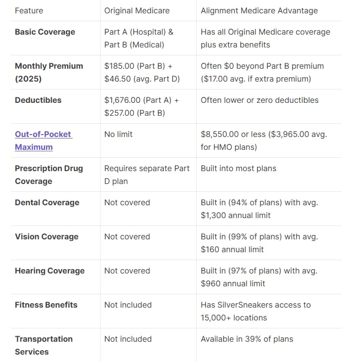 • Cost Protection: Alignment Medicare Advantage caps annual out-of-pocket costs at $8,550 or less, while Original Medicare has no spending limit, potentially exposing you to unlimited healthcare expenses.